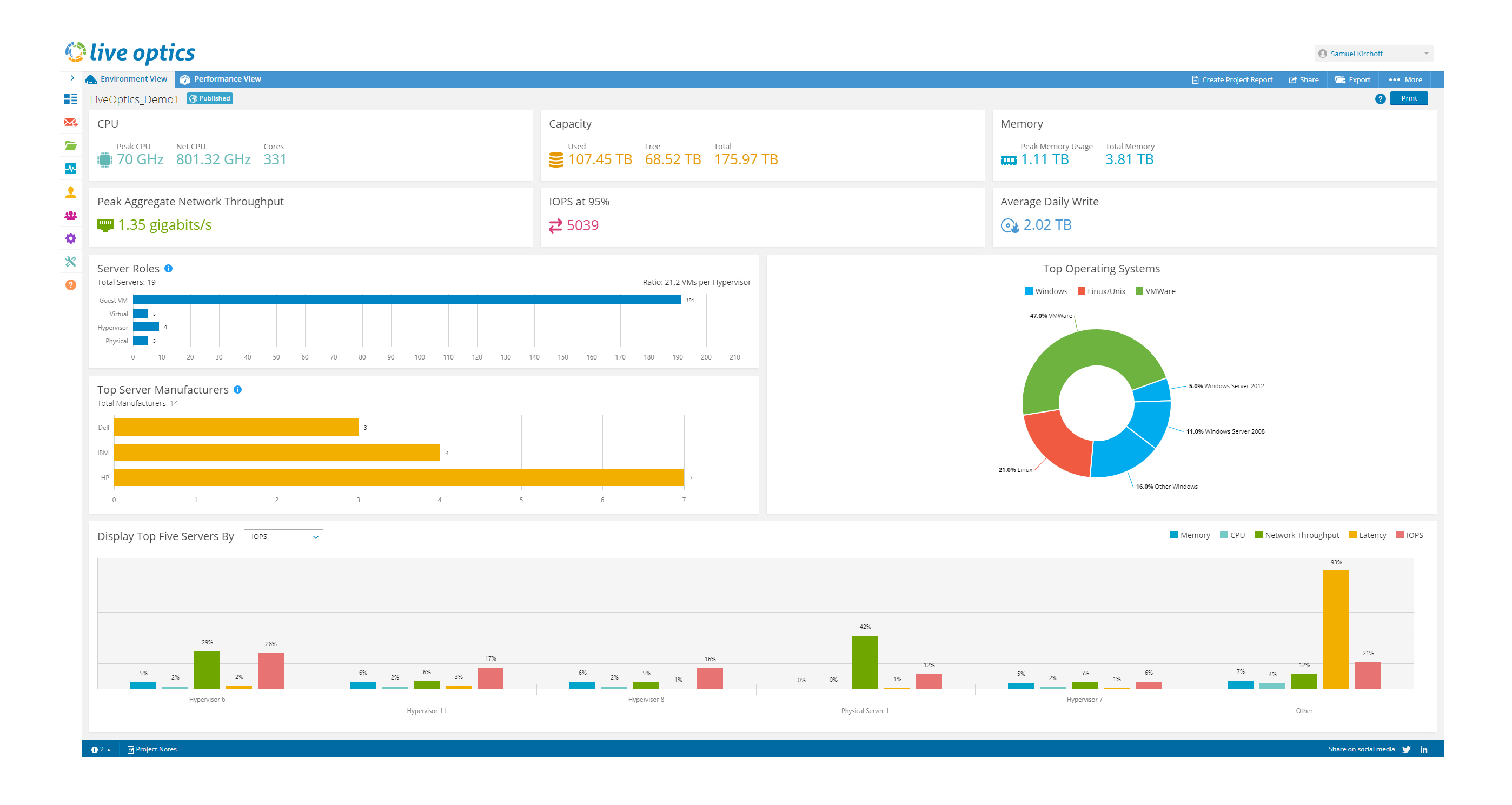 Live Optics 控制面板提供了您的 IT 环境及工作负载的清楚、准确的视图,让您可以掌控一切。