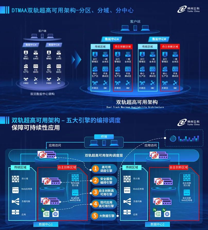 为助力银行业务高质量发展,更好地应对数字经济时代对可持续性的高要求,实现“信创”与“数字化”齐头并进,星空xk官网创新性的推出了双轨超高可用架构。该架构在双活数据中心的分区调度基础上,增加信创域和非信创域的分域调度,实行信创域与传统域应用全量部署,使双中心运营变为双中心四区域并行运行,互为多活,将“0到1”的单轨建设道路变为分区分域协同的多活双轨超高可用架构。帮助客户在新架构下,保障“信创”的同时解决性能瓶颈,提升稳定性,保证应用可持续性,最终实现信创区域和非信创区域的平滑过渡,完成国产化替代目标。