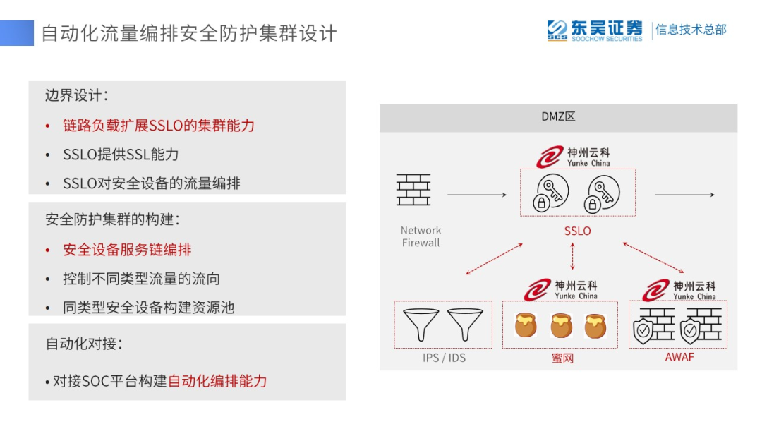 经过以上架构替换,东吴证券解决了串联架构的扩展性问题、加密流量可见性问题以及安全策略无法适应业务敏捷迭代问题,提升了运维的灵活性,实现了基于服务链的流量调度,保障了网络和安全投资回报最大化。